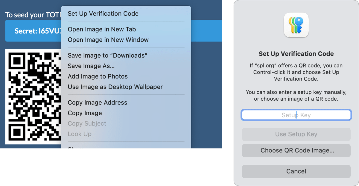 Apple managed this process extremely well once it started to support TOTPs, which it calls “verification codes.” On an account enrollment page displaying a TOTP enrollment QR code, you can Control/right-click the code in macOS or touch and hold on a Code in iOS/iPadOS and choose Set Up Verification Code (or similar language). This adds the secret to Passwords for that site.
