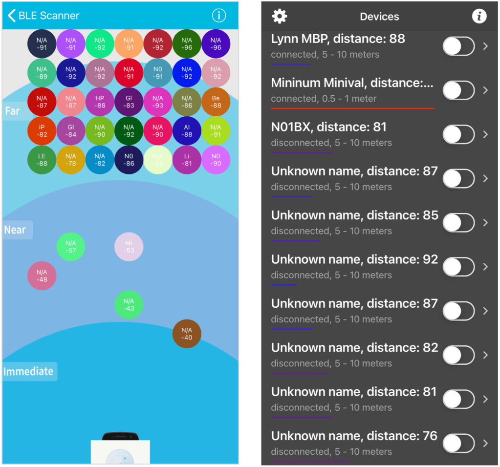 BLE Scanner is a limited but free app that provides a list of Bluetooth devices your iPhone or iPad can detect, and offers a mapping feature that roughly sorts them by signal strength into distance away. This is particularly useful if you’re checking out whether a car has a hidden AirTag; less so inside when there may be dozens of your own and neighbors’ devices close enough to register. Regular Bluetooth devices typically identify themselves generically (like my “HP OfficeJet Pro 9010 series” printer) or specifically, as with the sharing name of your Macs, iPhones, iPads, Apple TVs, FitBit trackers, and so on.